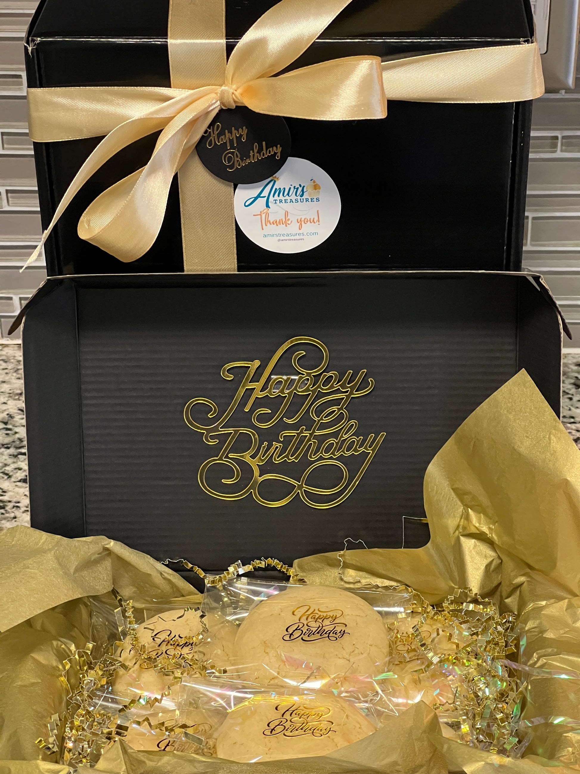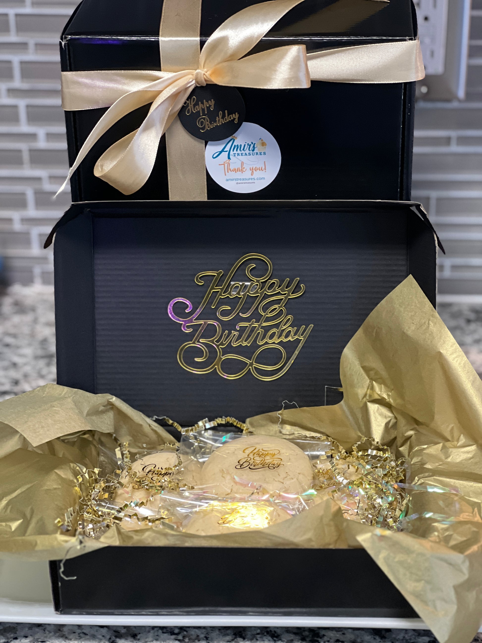 -filled with delicious cookies of your choice labeled “Happy Birthday”